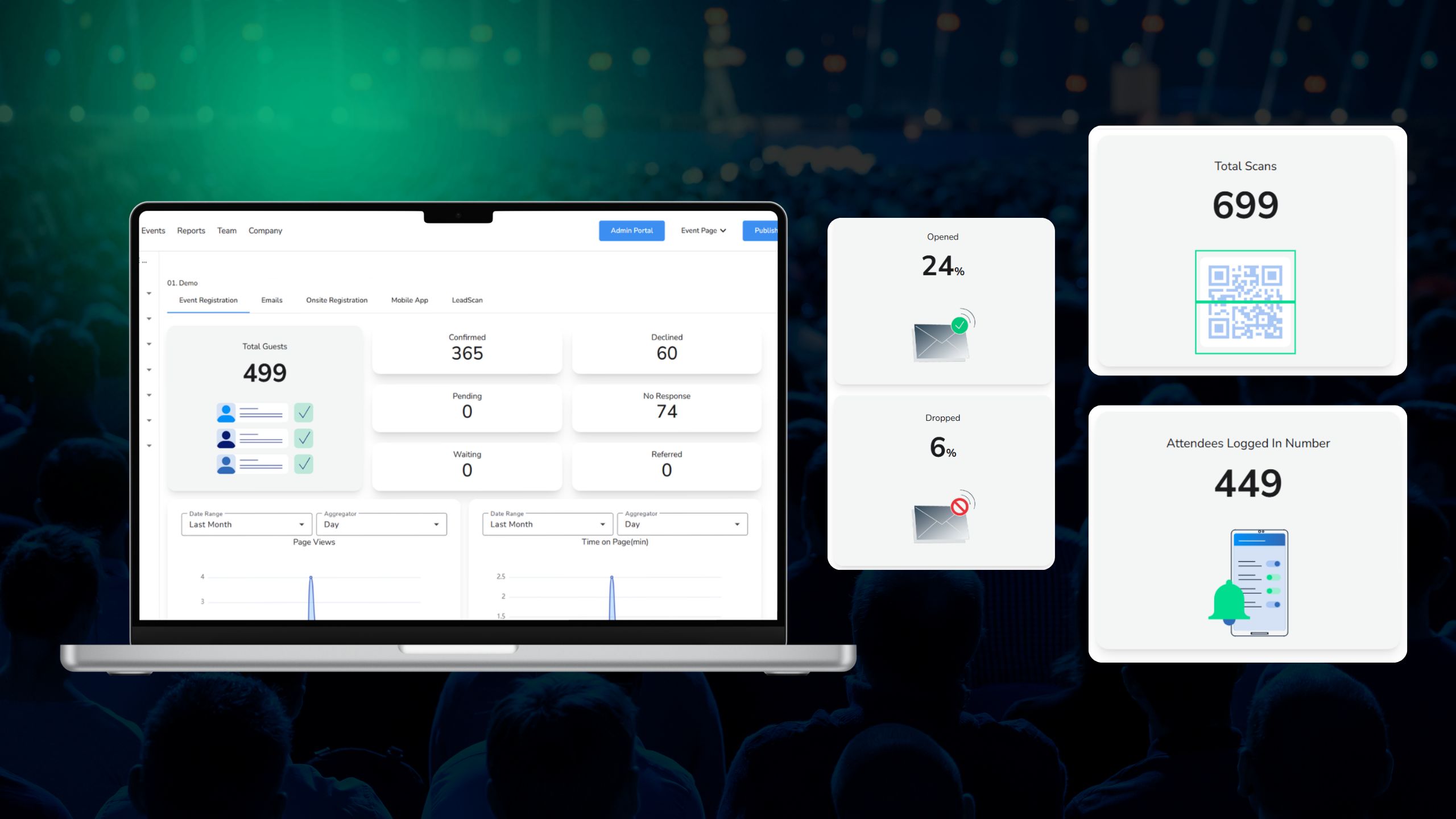 Attendance rates, session performance, peak arrival windows, lead capture totals, app engagement. Not a manual export from three different systems. One dashboard, updated in real time, exportable in one click.